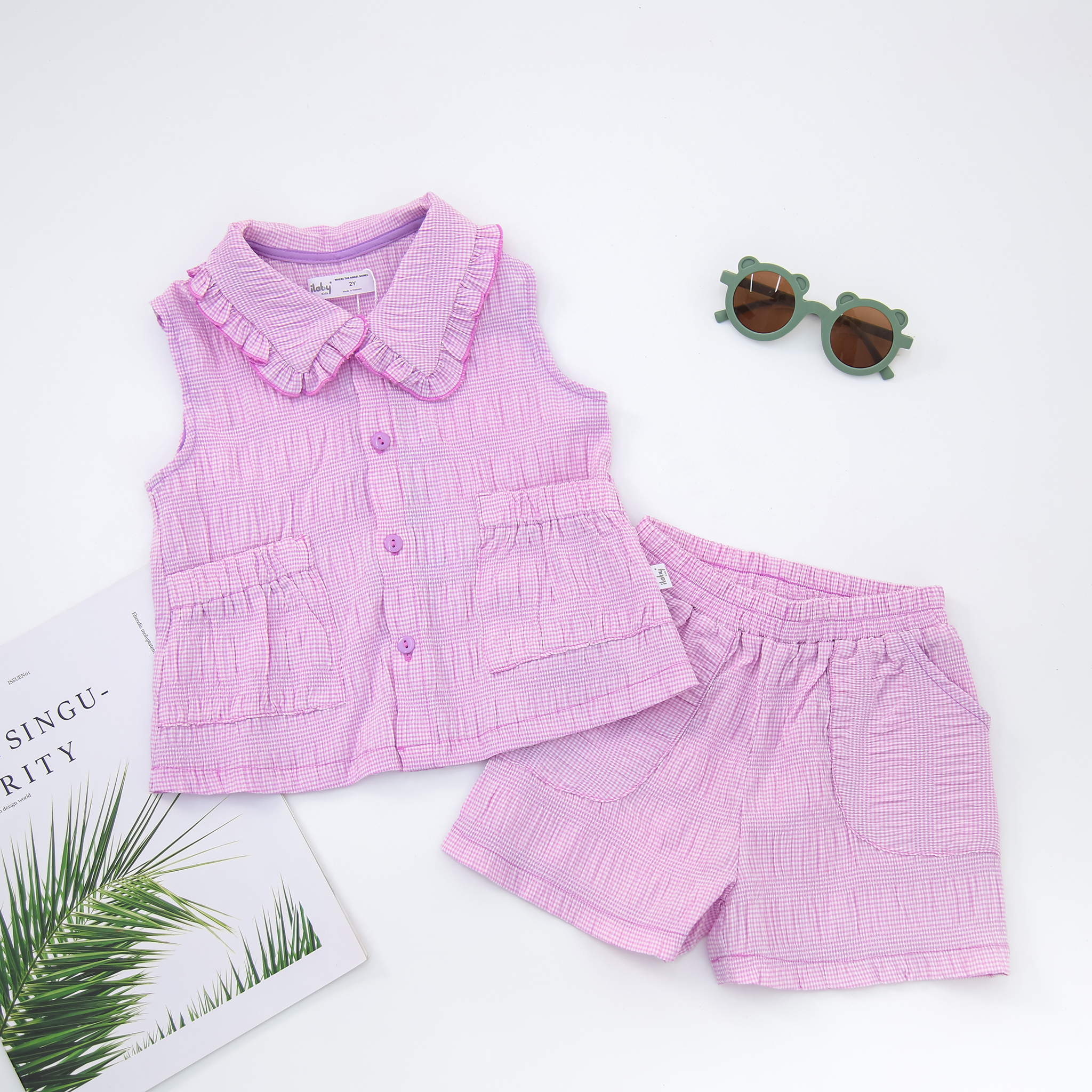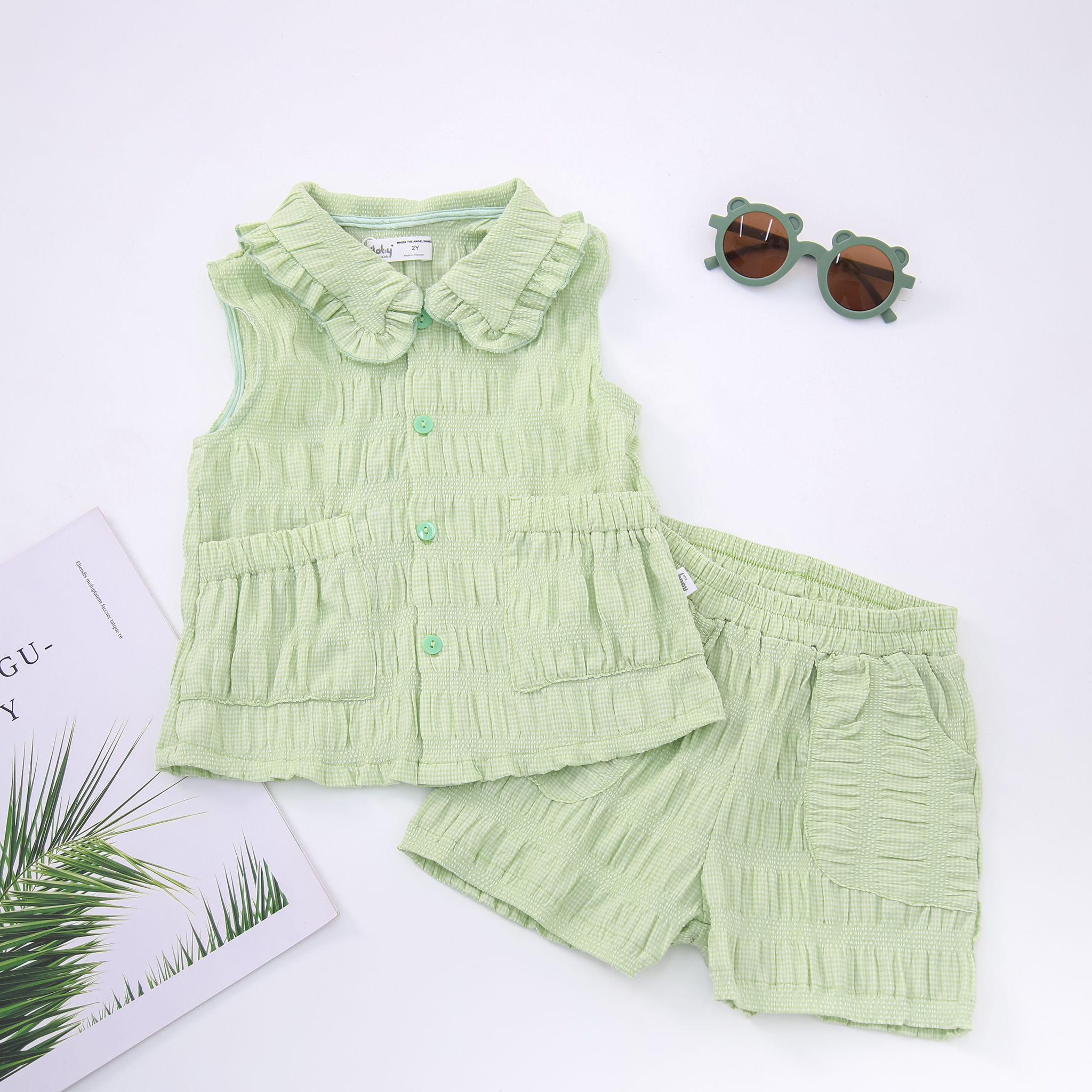 - Thiết kế áo khoét nách, dáng xòe baby, lá cổ viền bèo, 2 túi lớn cách điệu rút nhún chun miện túi. Quần short chun cả vòng, có túi lón, gấu viền bèo xua tan đi cái nóng mùa hè.