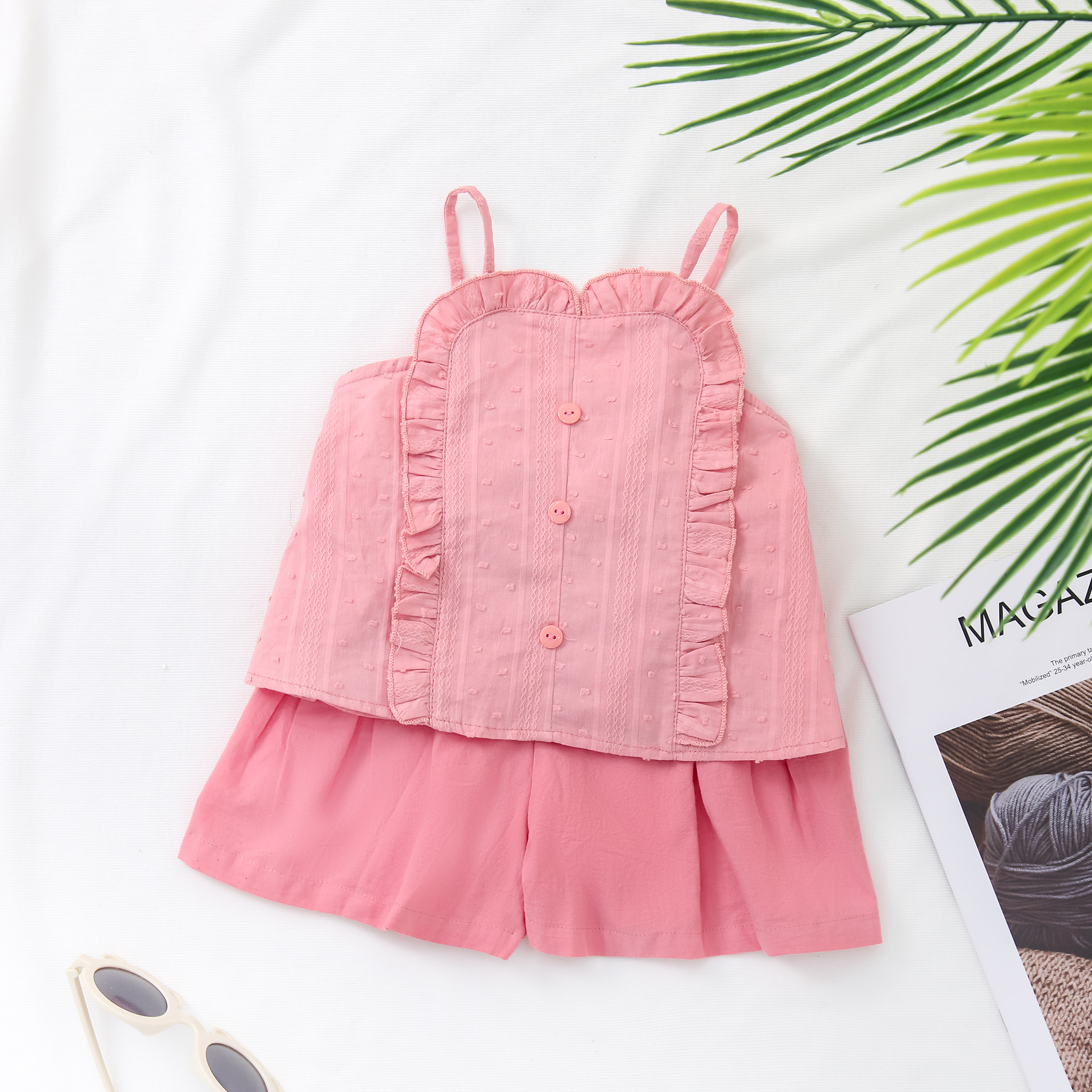 - Thiết kế Áo 2 dây yếm, viền bèo, phối cúc trang trí, dáng hơi xòe, quần short thô xòe rộng.