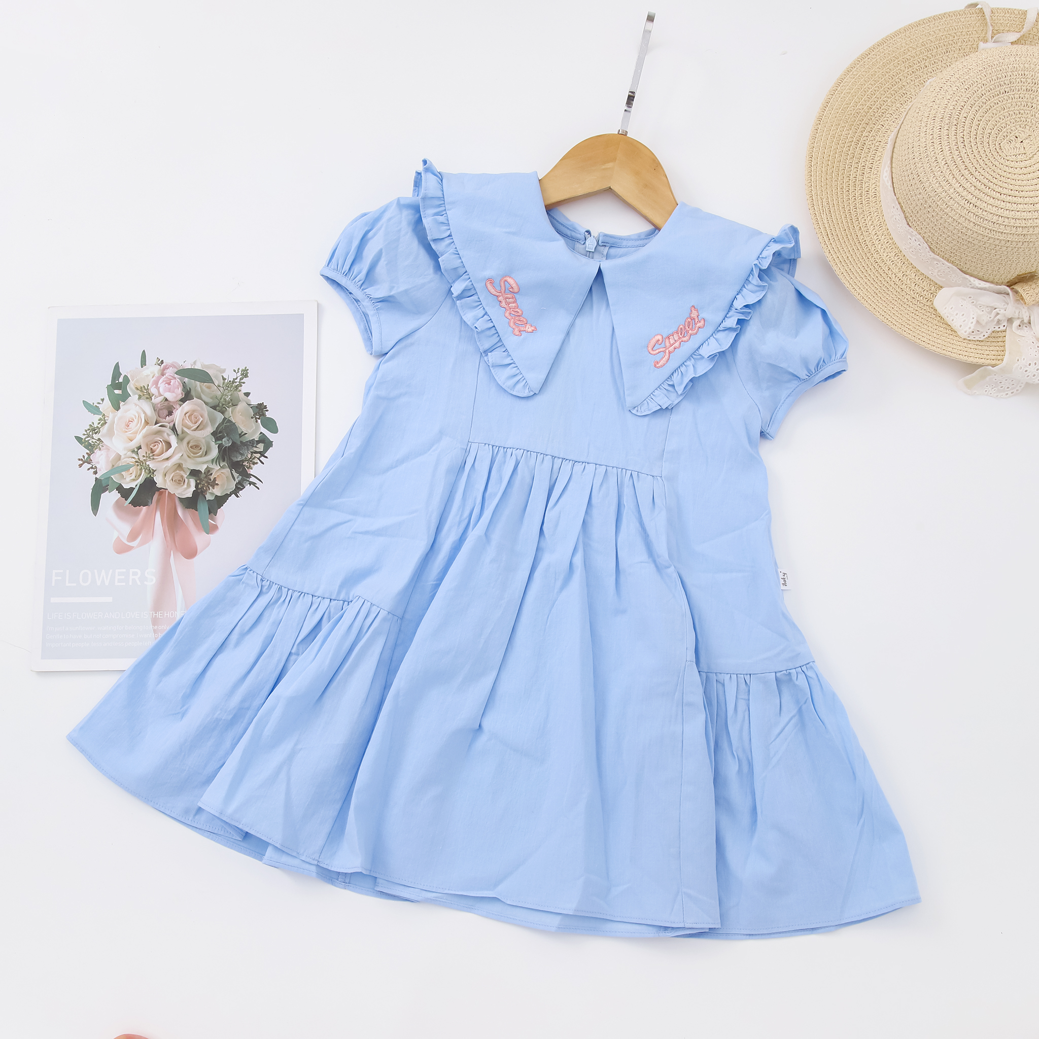 - Thiết kế lá cổ to, thêu chữ tạo sự điều đà và dáng babydoll giúp bé luôn dễ thương thu hút mọi ánh nhìn.